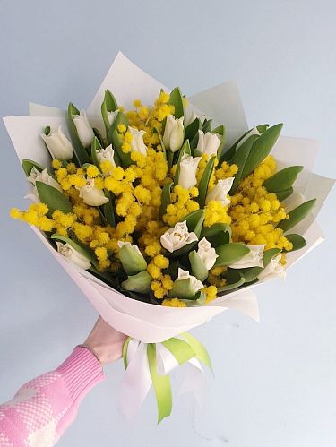 Букет из хризантем белого-розового цвета с зеленью. При желании можно собрать микс любых цветов.